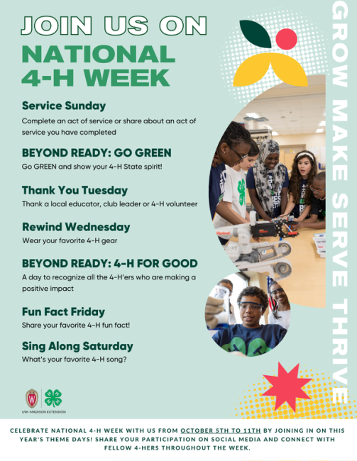 On Thursday of National 4-H Week, help shine a light on all the good 4-H’ers are doing to make a positive impact in their communities and beyond. Celebrate by sharing your own story or highlighting the efforts of another 4-H’er, volunteer, or educator who is making a difference. Post your “4-H For Good” story on social media. Tag Wisconsin 4-H and Extension Washington County, and use: #4HBeyondReady #National4HWeek