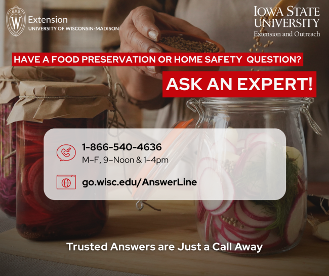 UW-Madison Extension has partnered with Iowa State University Extension and Outreach’s AnswerLine to give Wisconsin residents access to trained Extension professionals who provide research-based, trustworthy guidance on safe canning, freezing, drying, and other household questions. Call 1-866-540-4636, Monday through Friday, 9:00 a.m. to 12:00 p.m. and 1:00 to 4:00 p.m. or email answer@iastate.edu.