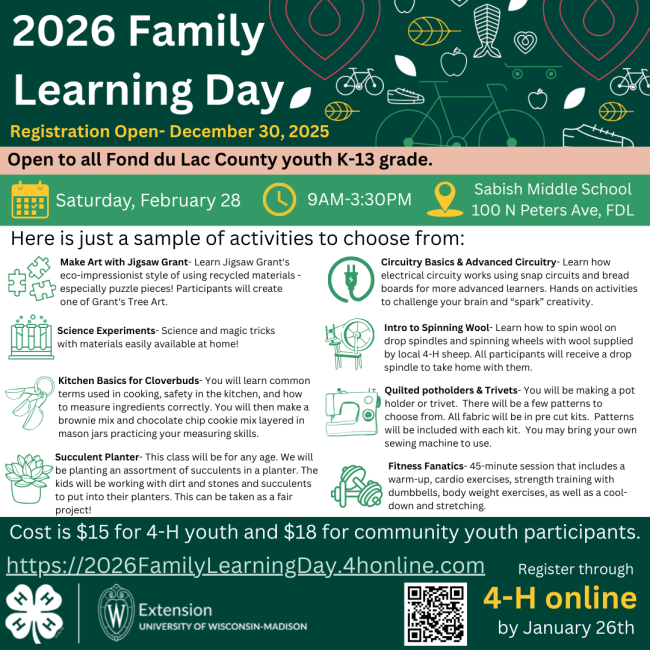 Payment for this event must be mailed to the Extension Office by February 16, 2026 to hold your sessions. PLEASE print your invoice from “4-H Online” and make a CHECK payable to Fond du Lac County and mail to: UW Extension Fond du Lac County, Attn: 4-H Family Learning Day, 160 S Macy St, Fond du Lac, WI 54935.