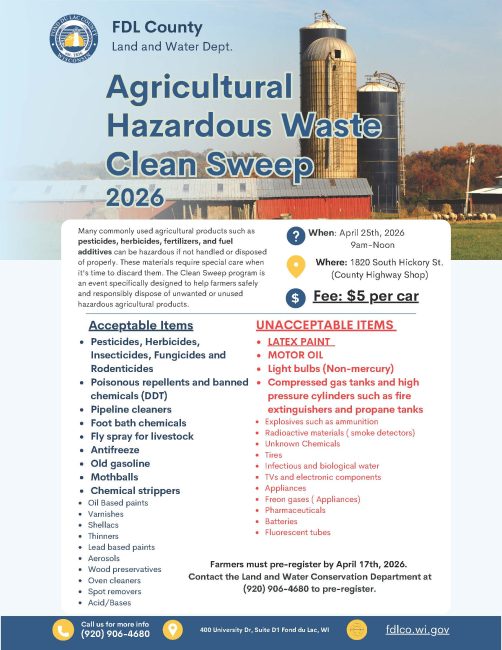 - Farms & Agricultural Businesses must pre-register with Fond du Lac County Land & Water Conservation office at (920) 906-4680 by Friday, April 17th.