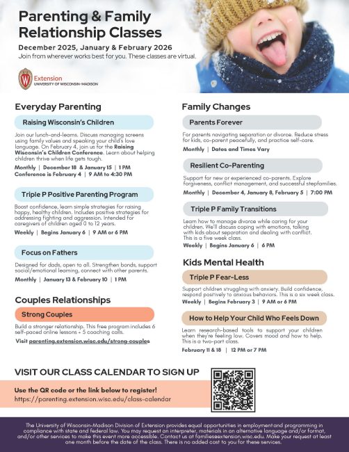 Extension provides education promoting family strengths and help communities become positive environments for family life. Programs respond to individual, family and community needs with research-based education and partnerships that support Wisconsin families and communities.