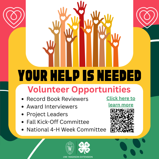 Extension volunteers work with staff to deliver educational programs using University and other high-quality educational resources. Anyone who is at least 18 years old by September 1 can apply to become a Wisconsin 4-H volunteer as long as they are not enrolled as a high school student. To find out more about volunteering, contact Tracy Keifenheim at 920-906-4625.